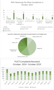 For the month of October 2025, the Public Utilities Commission of Texas (PUCT) complaint staff received a total of 980 complaints. The total volume of complaints was similar to those received in September. The PUCT received 107 fewer electric complaints in October than those received in September.