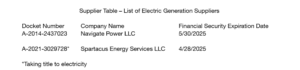 “As part of its EGS license validation procedures, the Commission’s Bureau of Technical Utility Services sent a 90-day Security Renewal Notice email to each entity in the Supplier Table above stating that original documentation of a bond, or other approved security in the amount or language directed by the Commission, must be filed within 30-days prior to each entity’s security expiration date. None of the companies listed in the Supplier Table provided the required documentation.”