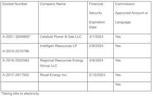 “As part of its EGS license validation procedures, the Commission’s Bureau of Technical Utility Services sent a 90-day Security Renewal Notice email to each entity in the Supplier Table above stating that original documentation of a bond, or other approved security in the amount or language directed by the Commission, must be filed within 30-days prior to each entity’s security expiration date. None of the companies listed in the Supplier Table provided the required documentation. “