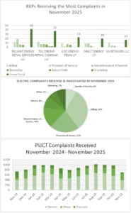For the month of November 2025, the PUCT complaint staff received a total 704 complaints. This is approximately 300 less than they received in October; however, this is in line with what they typically receive in November.
