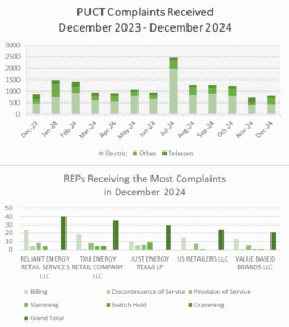 For the month of December 2024, the PUCT complaint staff received a total of 812 complaints, up from the 737 they received in November. Electric complaints also rose slightly from those received by the PUCT in November. This information is presented in the first chart, below.