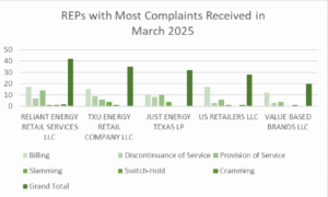 In March, REP complaints comprised approximately 49% of the total volume of complaints related to electric service. The five REPs receiving the most complaints in March accounted for approximately 51% of all the REP complaints. The chart at the bottom shows five REPs receiving the most complaints and the types of complaints each company receives. To obtain company-specific information, please contact us.