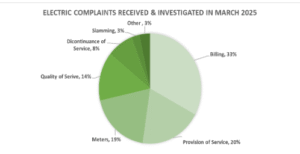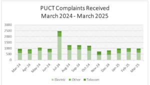For the month of March, 2025, the PUCT complaint staff received a total of 982 complaints, approximately the same number received in February. Electric complaints slightly decreased from those received by the PUCT in February. This information is presented in the first chart, below.